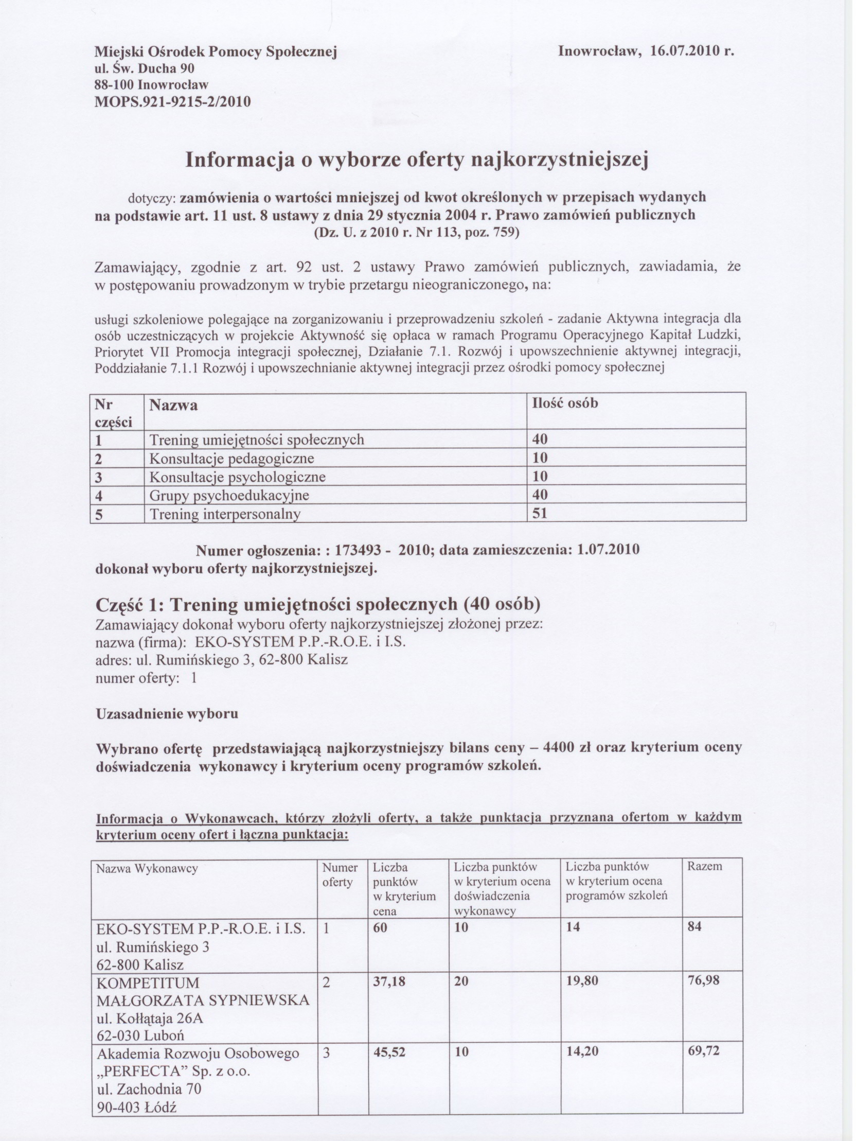 Inowrocław: Przedmiotem zamówienia są usługi szkoleniowe polegające na zorganizowaniu i przeprowadzeniu szkoleń - zadanie Aktywna integracja dla osób uczestniczących w projekcie Aktywność się opłaca w ramach Programu Operacyjnego Kapitał Ludzki, Priorytet VII Promocja integracji społecznej, Działanie 7.1. Rozwój i upowszechnienie aktywnej integracji, Poddziałanie 7.1.1 Rozwój i upowszechnianie aktywnej integracji przez ośrodki pomocy społecznej Numer ogłoszenia: 173493 - 2010; data zamieszczenia: 01.07.2010