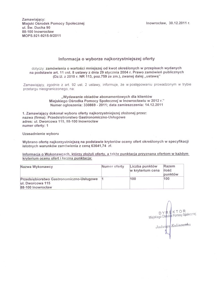 Inowrocław: Wydawanie obiadów abonamentowych dla klientów Miejskiego Ośrodka Pomocy Społecznej w Inowrocławiu w 2012 r Numer ogłoszenia: 330869 - 2011; data zamieszczenia: 14.12.2011 OGŁOSZENIE O ZAMÓWIENIU - usługi